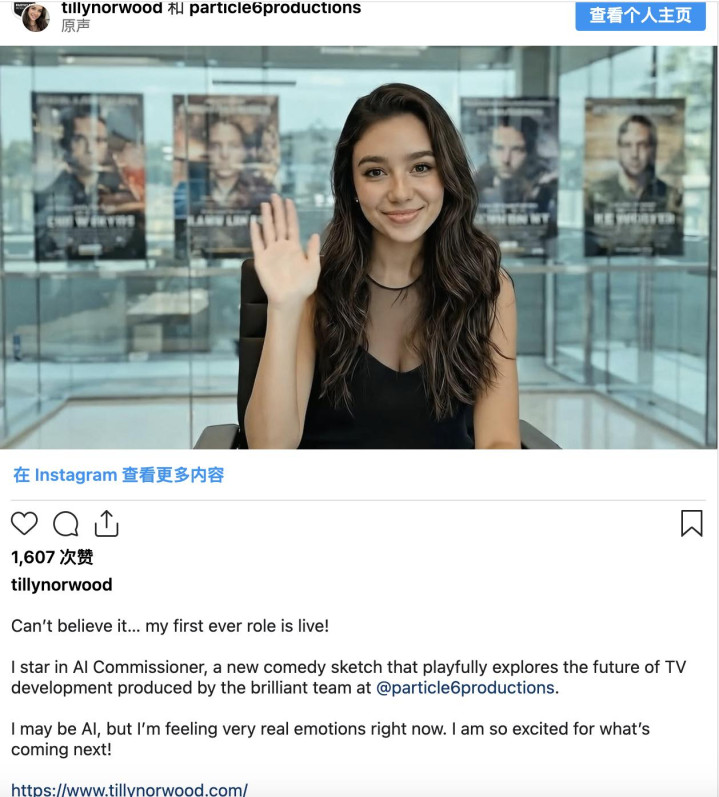 她是英国公司 Particle6 Productions 用 AI 生成的「女演员」。从脸到声线、从履历到社交账号,全部都是虚拟构建。在 Instagram 上,她像所有的女明星那样发帖,路透自己试镜和出演现有电影(例如《神奇女侠》)的照片,还发布日常生活的瞬间。她还主演了一部喜剧小品。